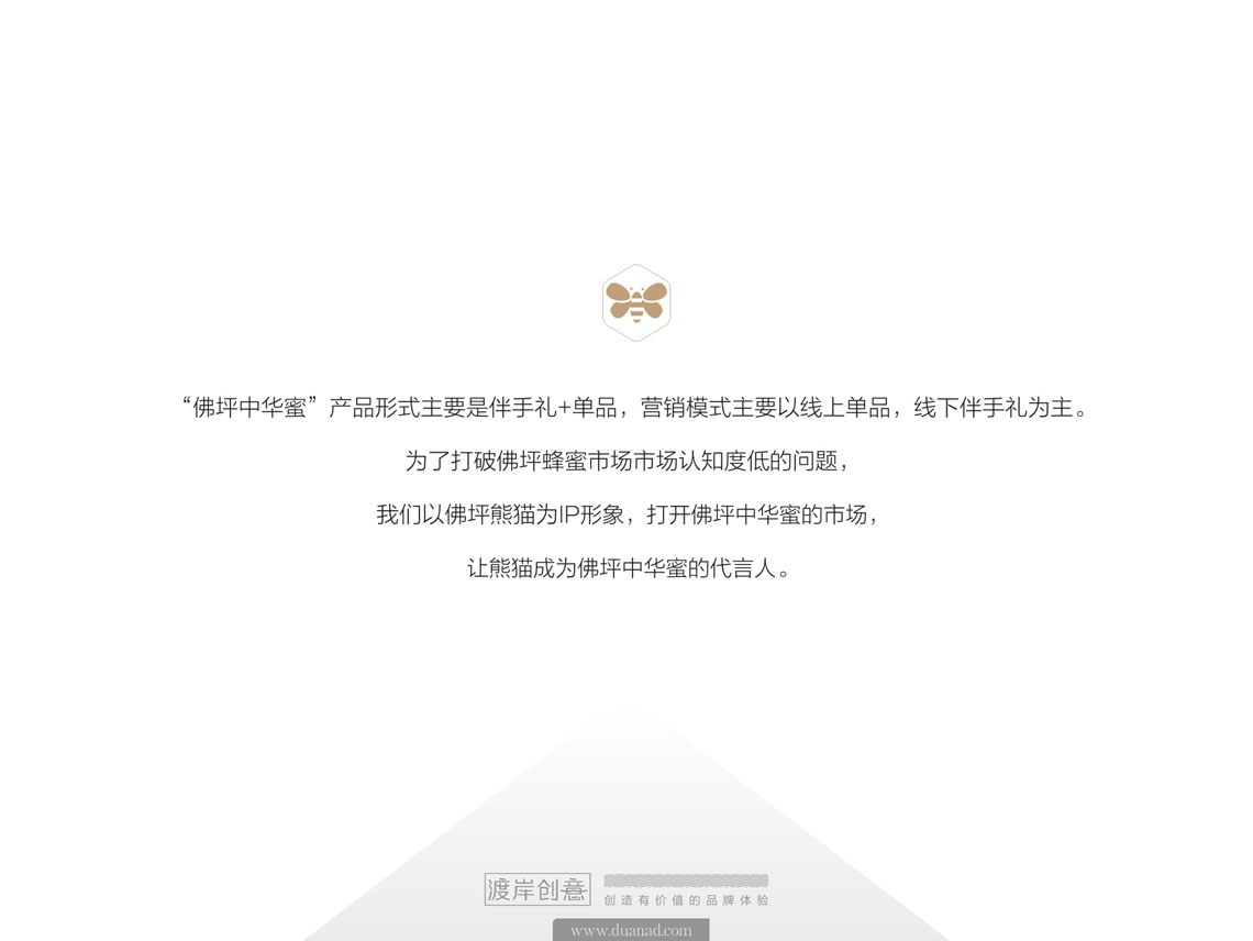 “佛坪中华蜜”产品形式主要是伴手礼+单品,营销模式主要以线上单品,线下伴手礼为主。为了打破佛坪蜂蜜市场市场认知度低的问题,我们以佛坪熊猫为IP形象,打开佛坪中华蜜的市场,让熊猫成为佛坪中华蜜的代言人。